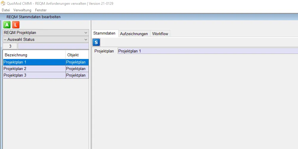 Version 21-0129, Anforderungen verwalten, Bildschirmfoto 3: Auswahl Projektplan 1 mit anklickbarer Darstellung der Anforderungen im unteren Bereich