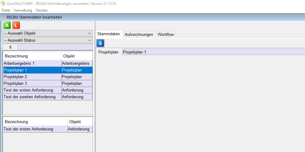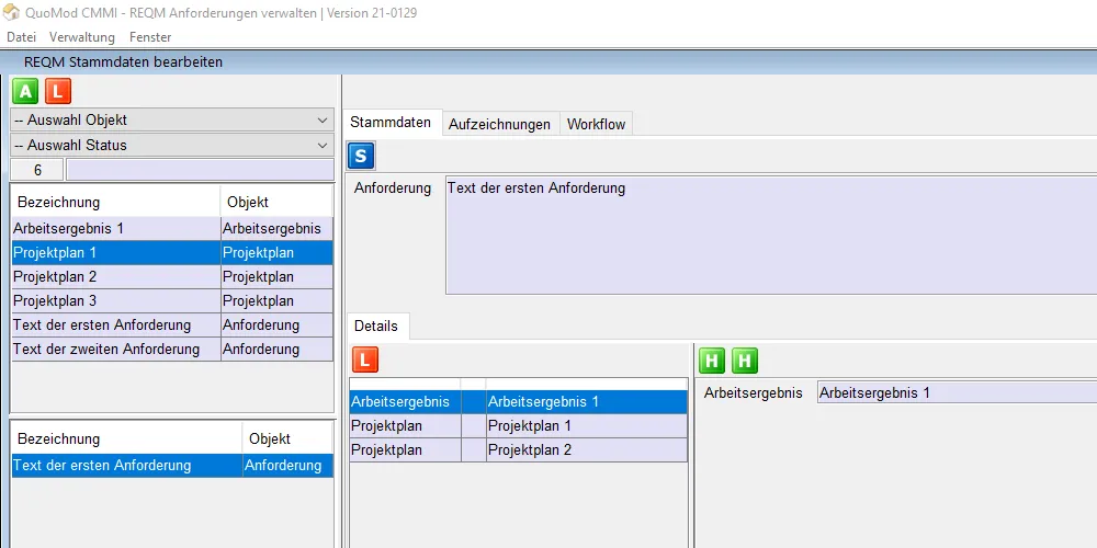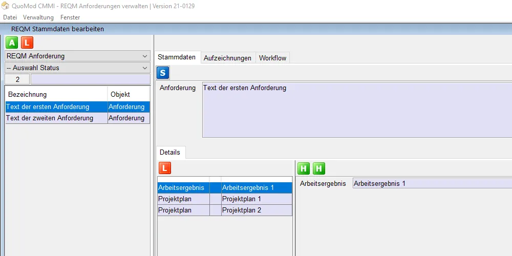 Version 21-0129, Anforderungen verwalten, Bildschirmfoto 4: Auswahl Anforderung 1 im unteren dargestellten Bereich